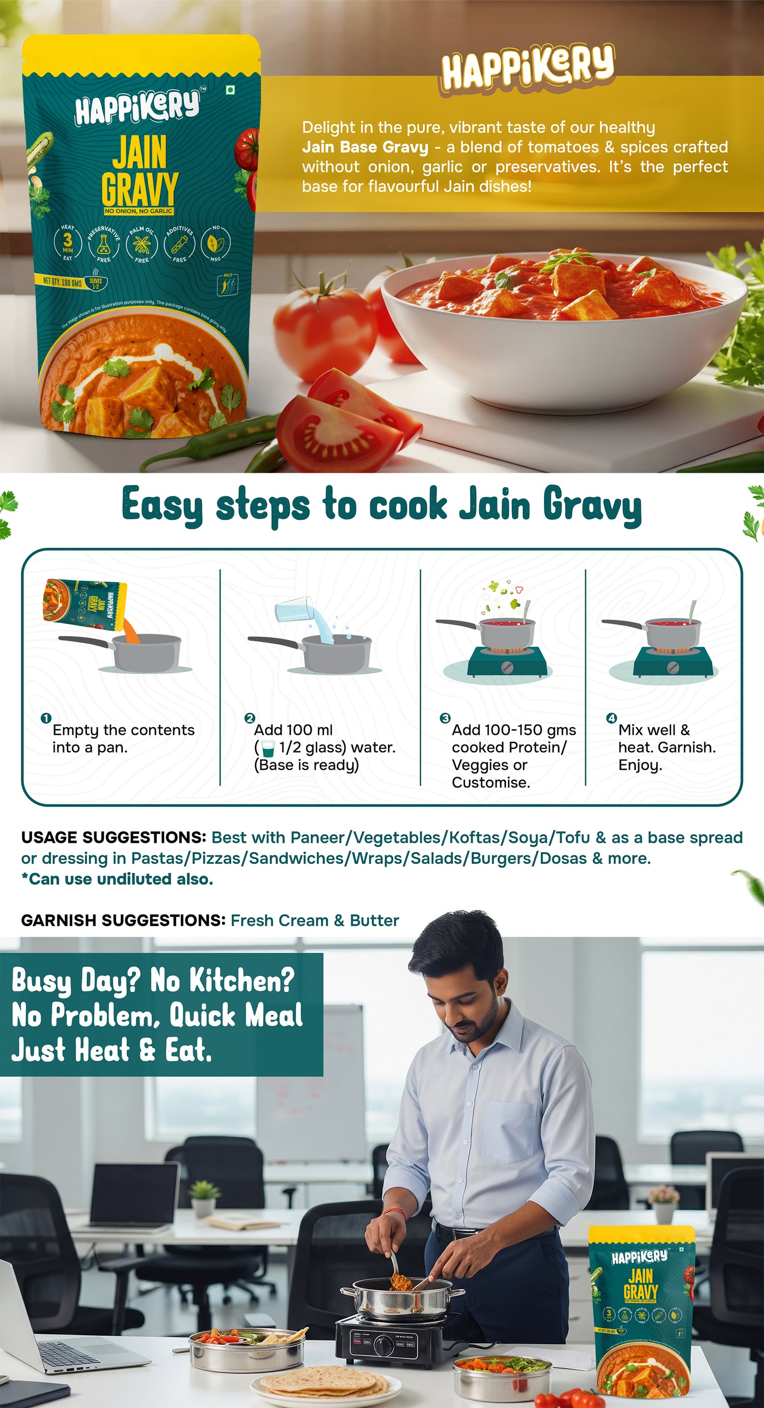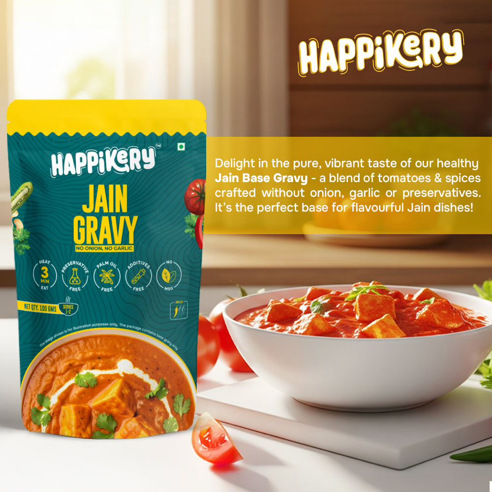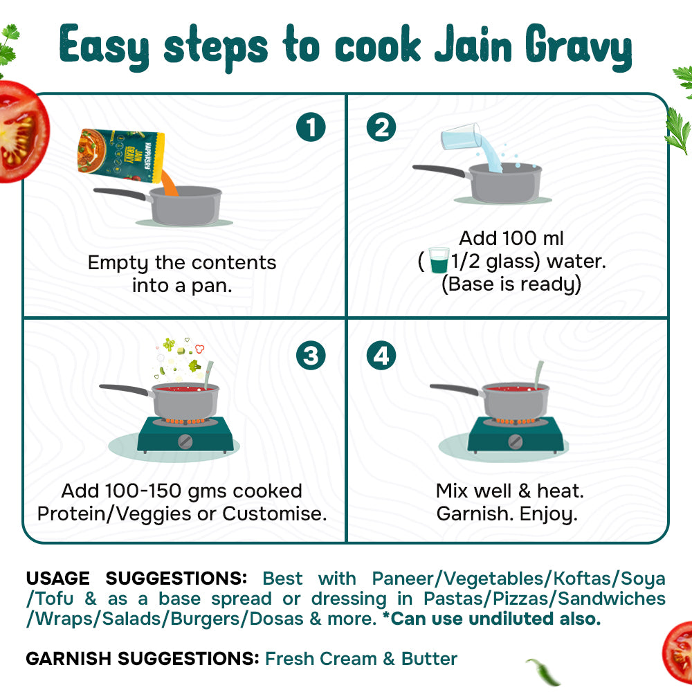 Delight in the pure, vibrant taste of our healthy Jain Base Gravy - a blend of tomatoes and spices crafted without onion, garlic or preservatives. It’s the perfect base for flavorful Jain dishes!